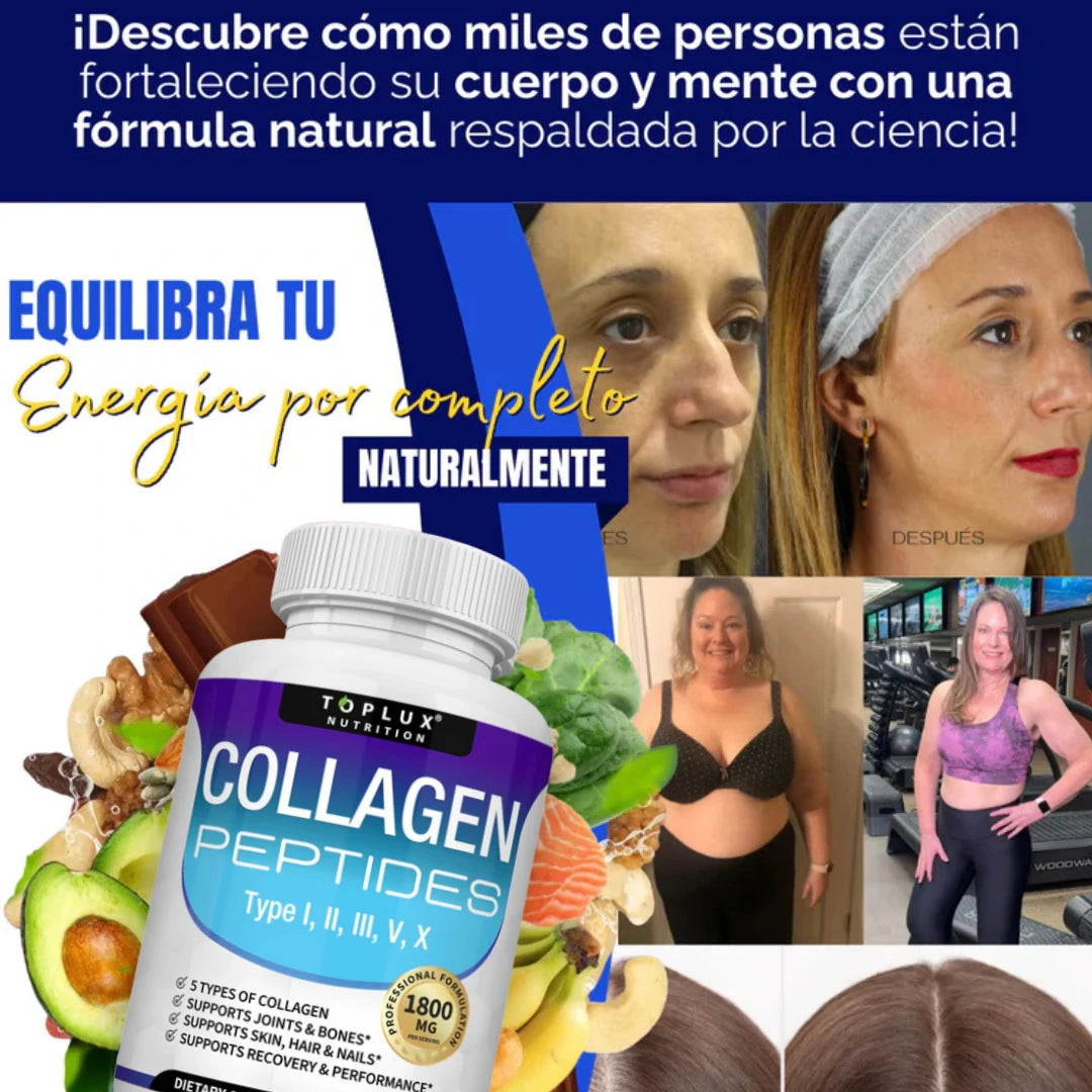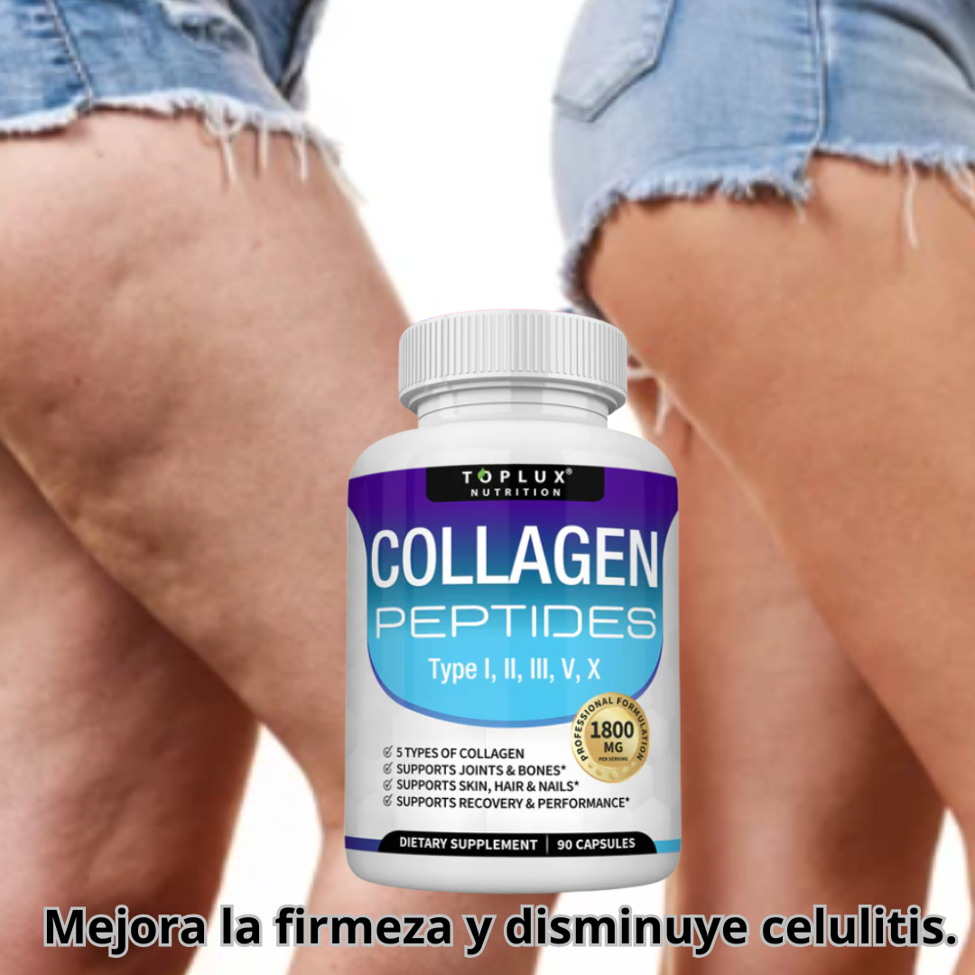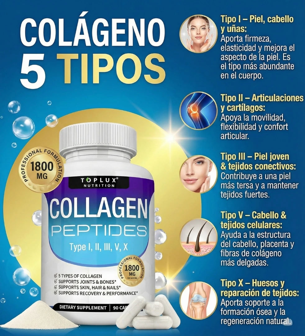 El Colágeno Péptidos Toplux contiene 5 tipos de colágeno (I, II, III, V y X), diseñados para apoyar piel, cabello, uñas, articulaciones y huesos al mismo tiempo. Además, está hidrolizado, por lo que el cuerpo lo absorbe más rápido y de manera más eficiente.