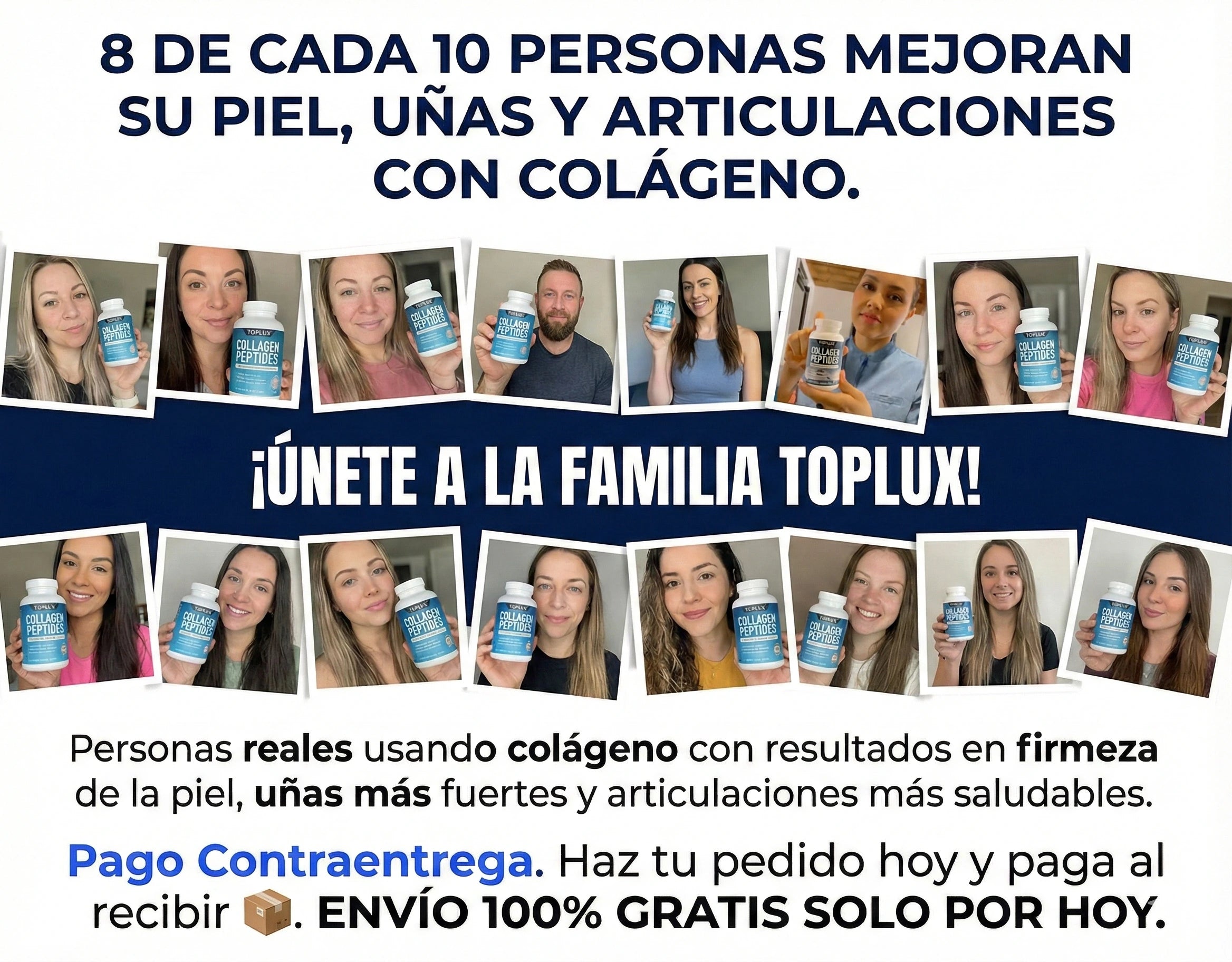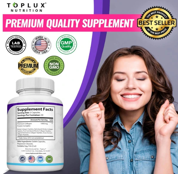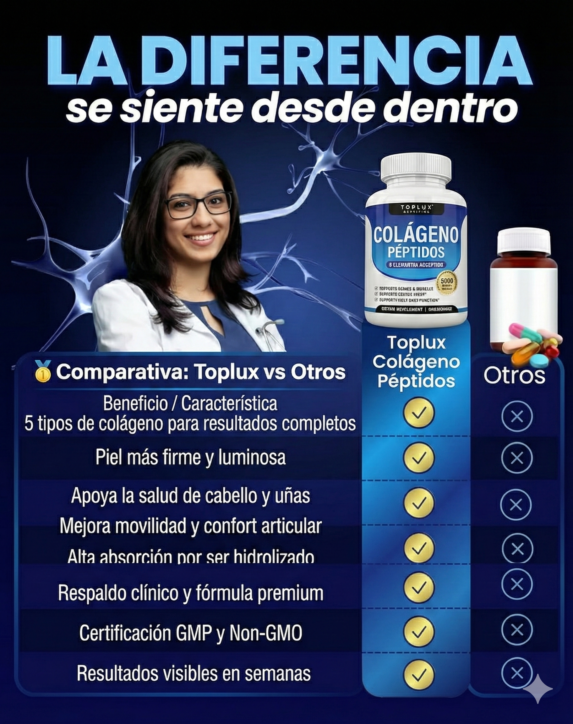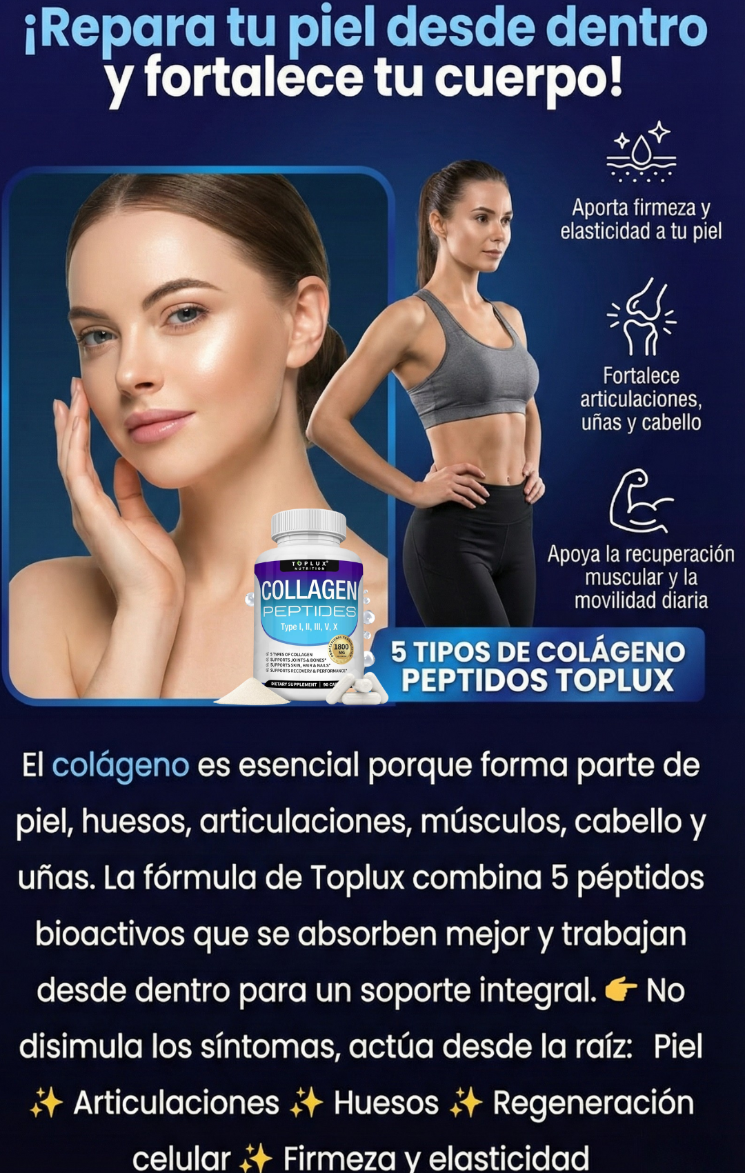 El Colágeno Péptidos Toplux contiene 5 tipos de colágeno (I, II, III, V y X), diseñados para apoyar piel, cabello, uñas, articulaciones y huesos al mismo tiempo. Además, está hidrolizado, por lo que el cuerpo lo absorbe más rápido y de manera más eficiente.