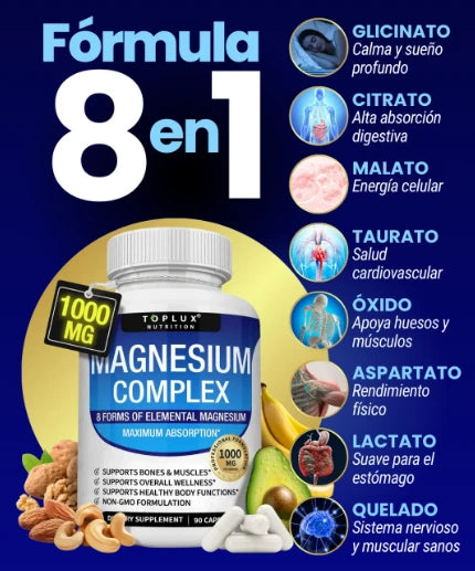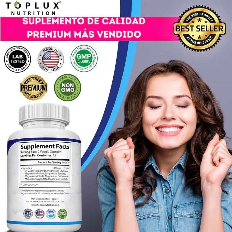 Mientras otras marcas ofrecen una o dos formas de magnesio, Toplux combina 8 tipos altamente biodisponibles para brindar resultados visibles en todos los niveles: energía, descanso, metabolismo, piel y bienestar emocional.