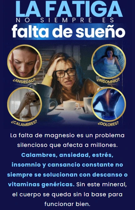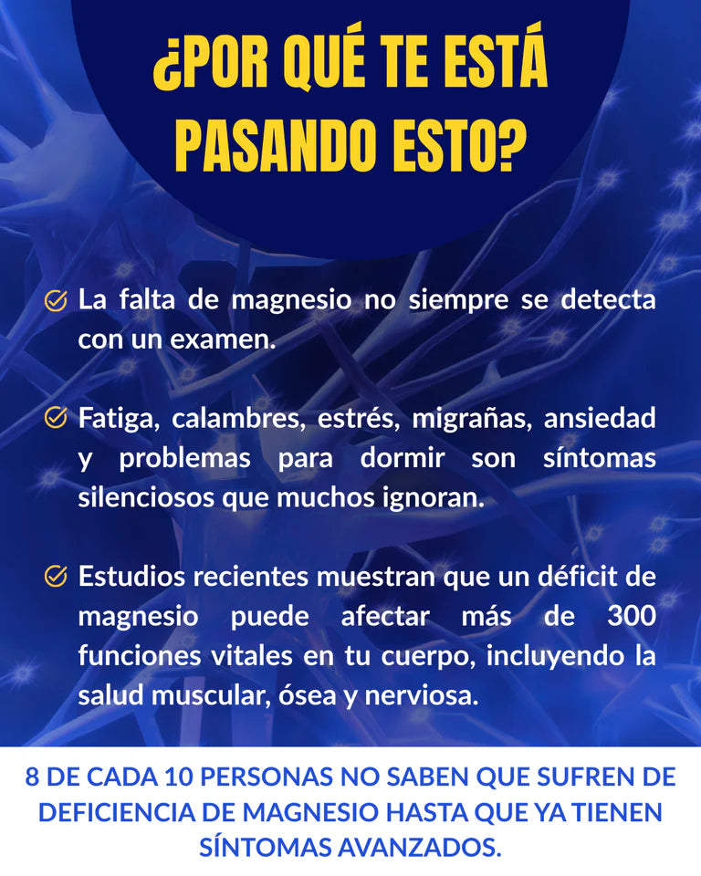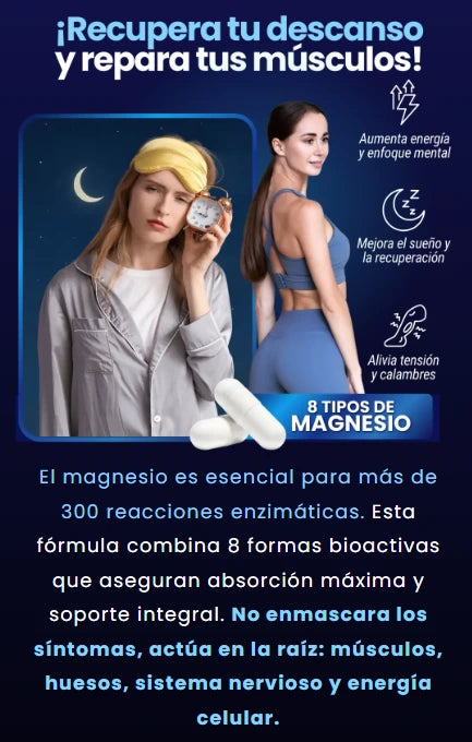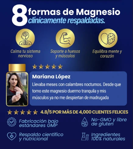 La mayoría de los suplementos de magnesio solo utilizan una o dos formas, lo que limita su absorción. El nuestro combina ocho formas clínicamente estudiadas para actuar sobre los músculos, los nervios, el sueño, la energía y mucho más, garantizando que tu cuerpo lo absorba y lo utilice realmente.